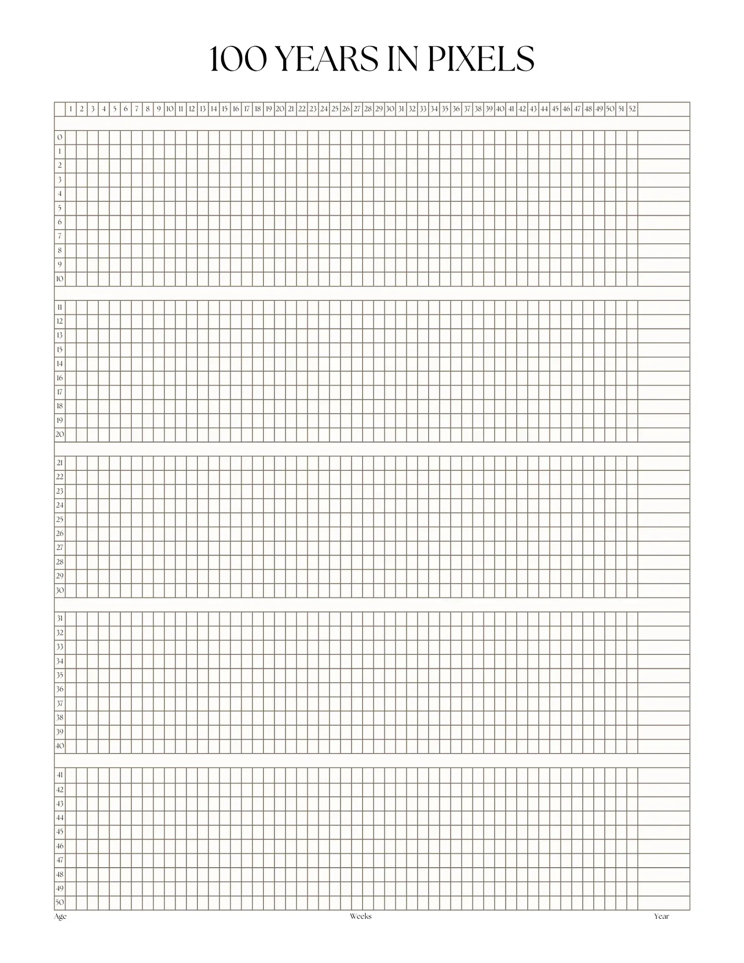 This minimalist “100 Years in Pixels” template offers a powerful visual of your lifespan. Print and post, because your time is your most valuable asset. Now you can see it.